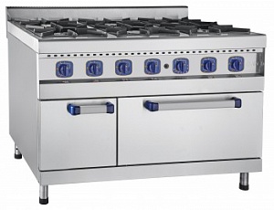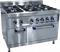 Плита имеет четыре горелки по 5,5 кВт и две мощные горелки по 7,5 кВт. Плита снабжена системой поджига и устройством "газ-контроль". Внизу - жарочный шкаф с одним противнем GN 2/1 и одной решеткой того же размера, изготовленные из нержавеющей стали. Рабочий диапазон температуры 120-320С. Плита имеет регулируемые по высоте ножки. В комплекте поставляются дополнительные съемные форсунки под "сжиженный" газ.