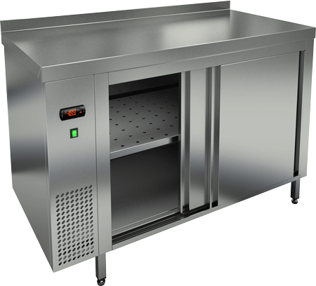 Нагрев объёма теплового стола производится с помощью электронагревателя (ТЭНа). Специальная конструкция препятствует нагреву всех внешних поверхностей, так как двойные стенки корпуса и дверок обеспечивают сохранение заданной температуры и защищают лицевые поверхности от нагрева. Горячие блюда раскладываются в подогретые тарелки, что исключает преждевременное остывание.