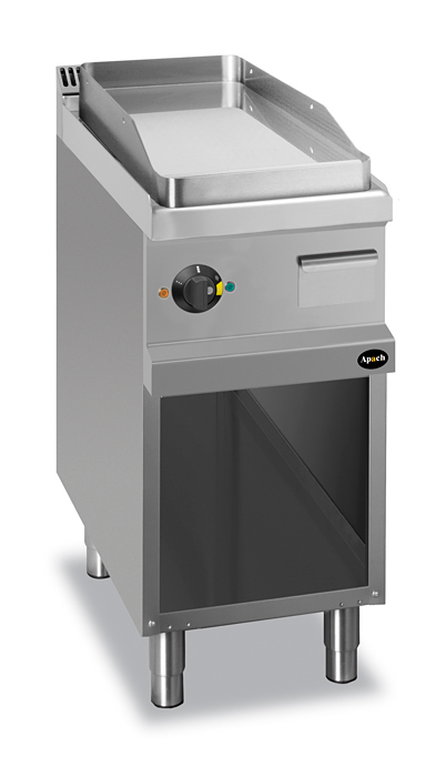 Открытая электрическая сковорода Apach APTE-47PL 700-й серии предназначена для обжарки мяса, рыбы и овощей на предприятиях общественного питания и торговли. Модель с закругленными краями и бортами оснащена электромеханической панелью управления с терморегулятором и 2 световыми индикаторами, выдвижным лотком для сбора остатков пищи, масла и жира и открытой подставкой с регулируемыми по высоте ножками. Корпус, рабочая поверхность, панель управления и вытяжная решетка выполнены из нержавеющей стали AISI 304, боковые и задняя панели - из нержавеющей стали AISI 430, лоток - из нержавеющей стали